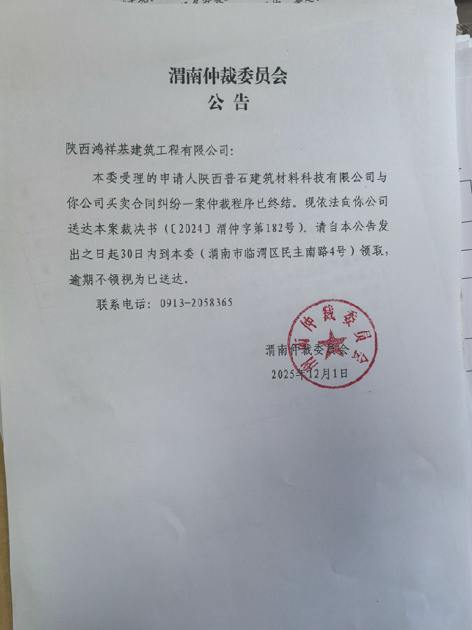 陜西普石建筑材料科技有限公司與陜西鴻祥基建筑工程有限公司之間買賣合同一案公告